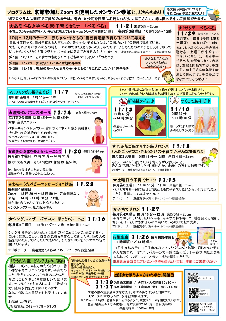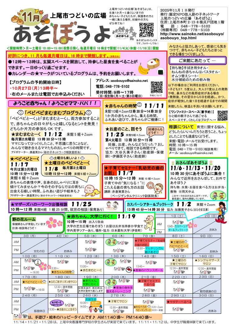 つどいの広場あそぼうよの2025年11月の月間予定をアップしました(2025年10月25日)
